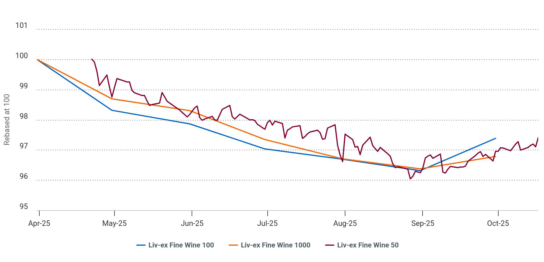 Source: Liv-ex Fine Wine 100, Liv-ex Fine Wine 50, Liv-ex Fine Wine 50 data from March 2025 to October 2025.