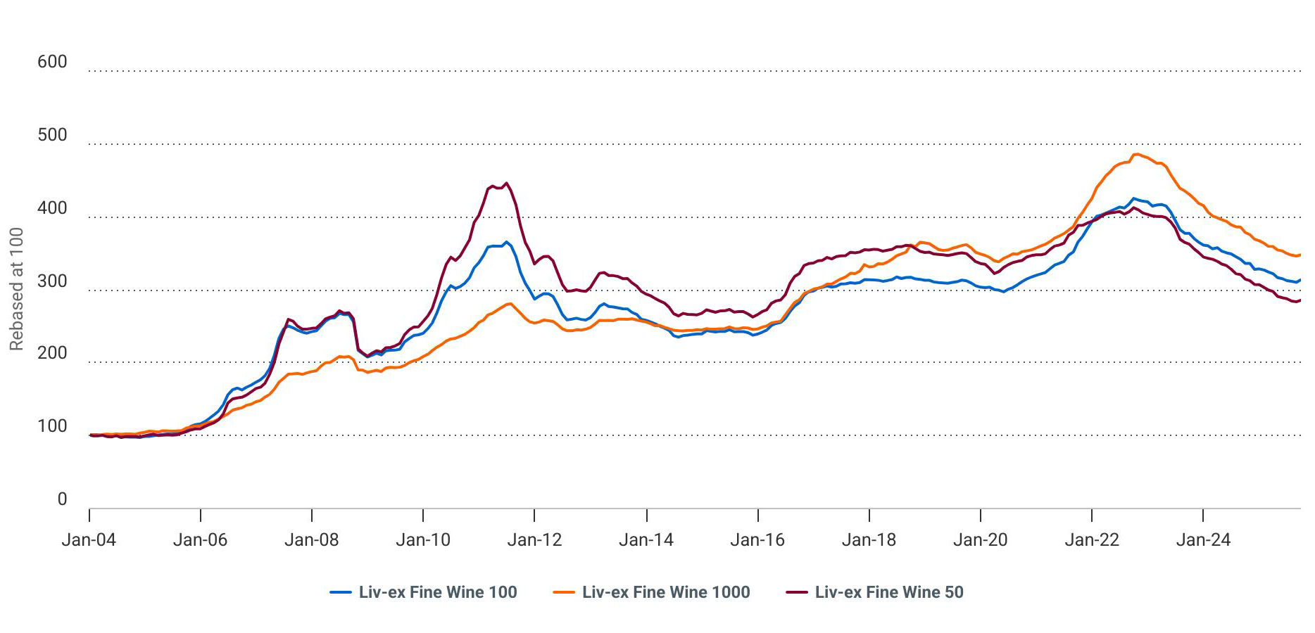 Source: Liv-ex Fine Wine 100, Liv-ex Fine Wine 50, Liv-ex Fine Wine 50 data from December 2003 to September 2025.
