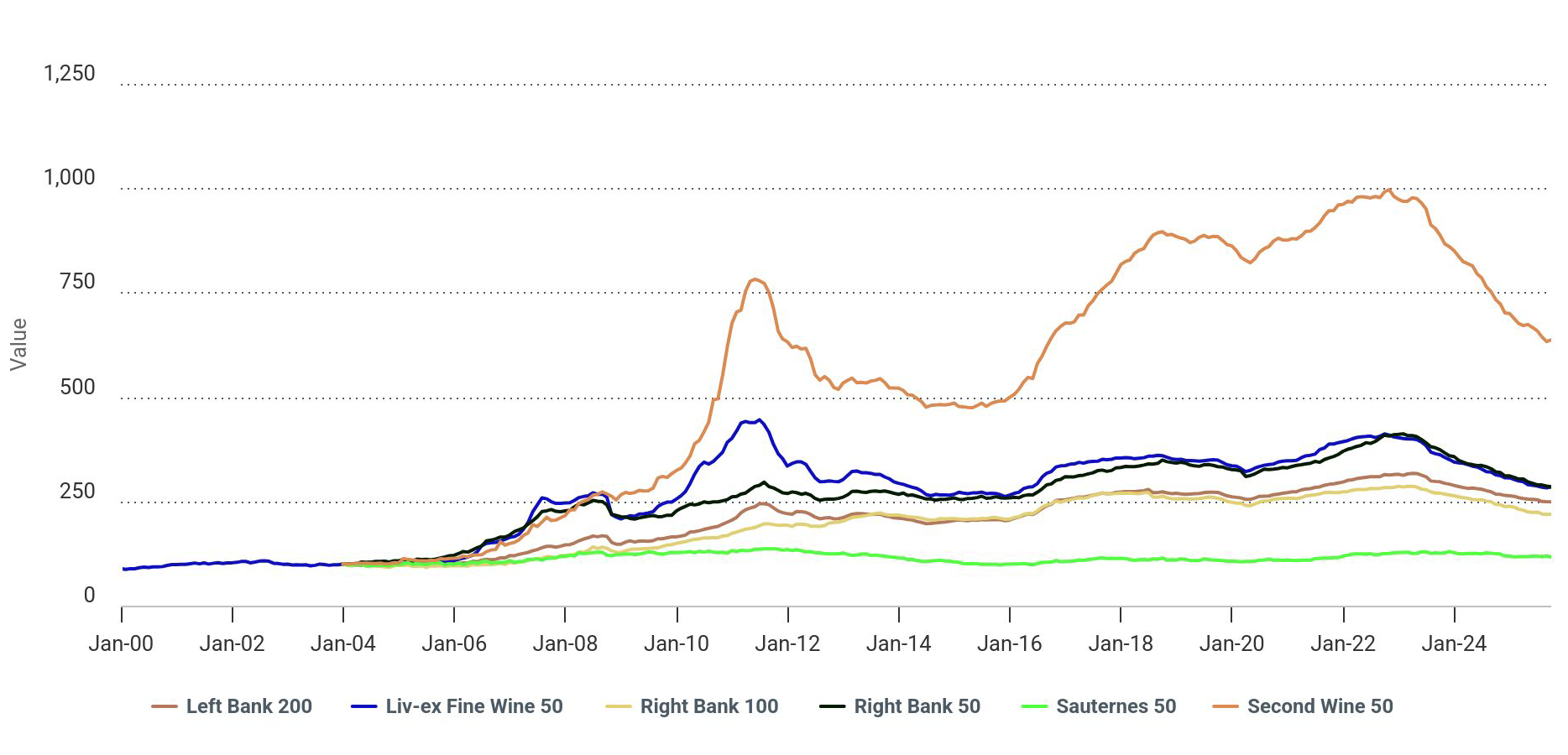 Source: Live-ex, Fine Wine 50, Right Bank 50, Second Wine 50, Sauternes 50, Right Bank 100 and Left Bank 200 data from December 1999 to September 2025.