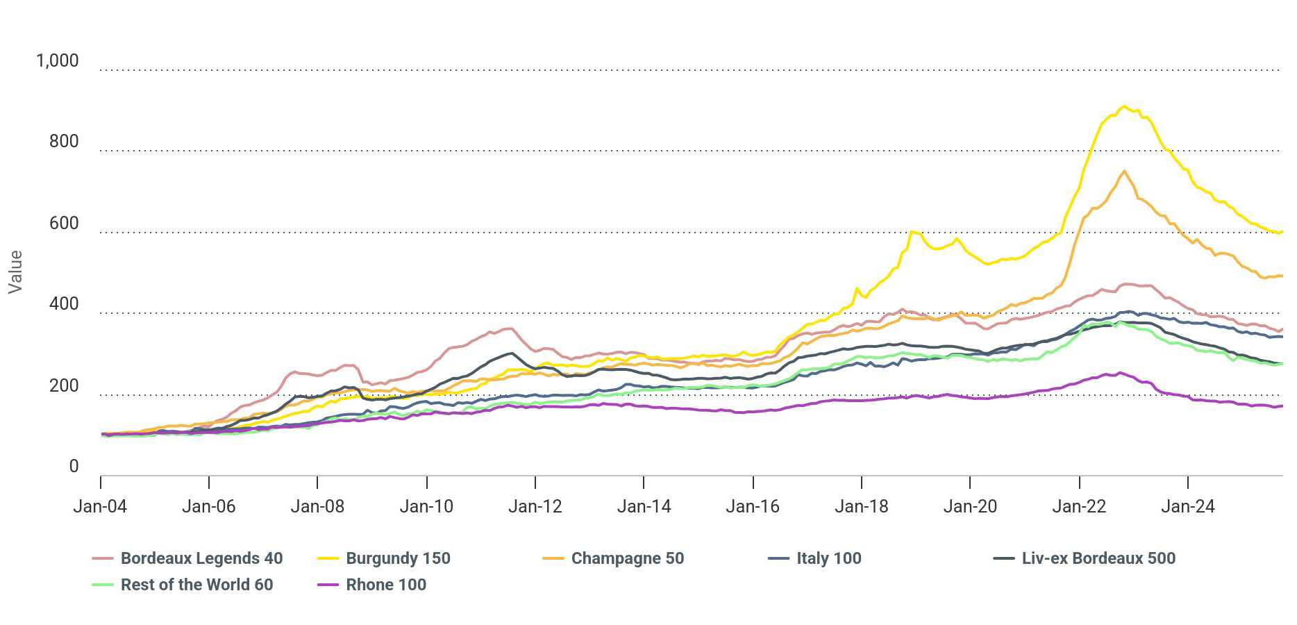 Source: Liv-ex, Bordeaux 500, Bordeaux Legends 40, Burgundy 150, Champagne 50, Rhône 100, Italy 100, Rest of the World 60 data from December 2003 to September 2025.