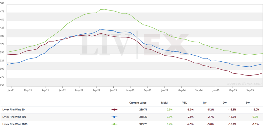 The headline numbers are modest, but meaningful in context. Over the last four months of 2025, the Liv-ex Fine Wine 50 and Fine Wine 100 rose around 2.5%, while the Liv-ex Fine Wine 1000 rose around 1%. The caveat matters as much as the advance: the market remained roughly 25% to 30% below its previous peak.