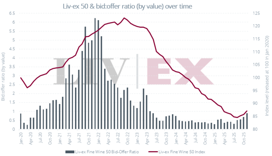 Turning points in fine wine tend to be confirmed by behaviour, not by commentary. The clearest behavioural evidence in late 2025 was the improvement in liquidity, particularly in the bid side of the market.