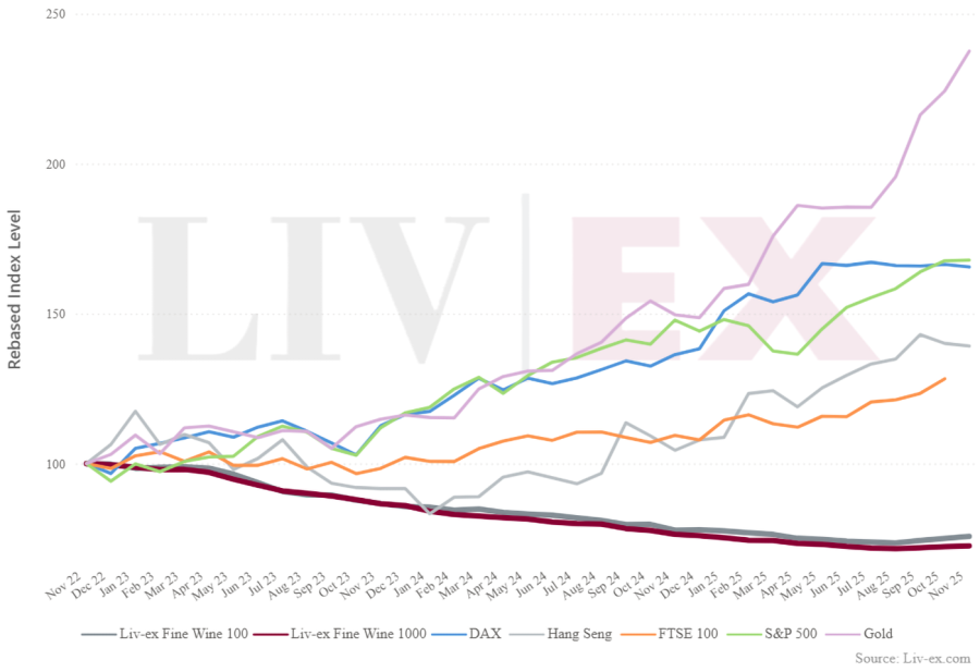 While fine wine continued to work through its internal correction, equities and gold performed strongly over the period shown, while crypto remained volatile, with bitcoin’s decline erasing gains during the year.
