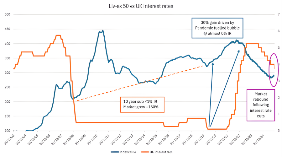 This chart shows the close relationship between UK interest rates and fine wine prices (Liv-ex 50). Periods of low or falling interest rates have consistently supported strong price growth in fine wine, as investors look for real assets that preserve value when cash returns are weak.